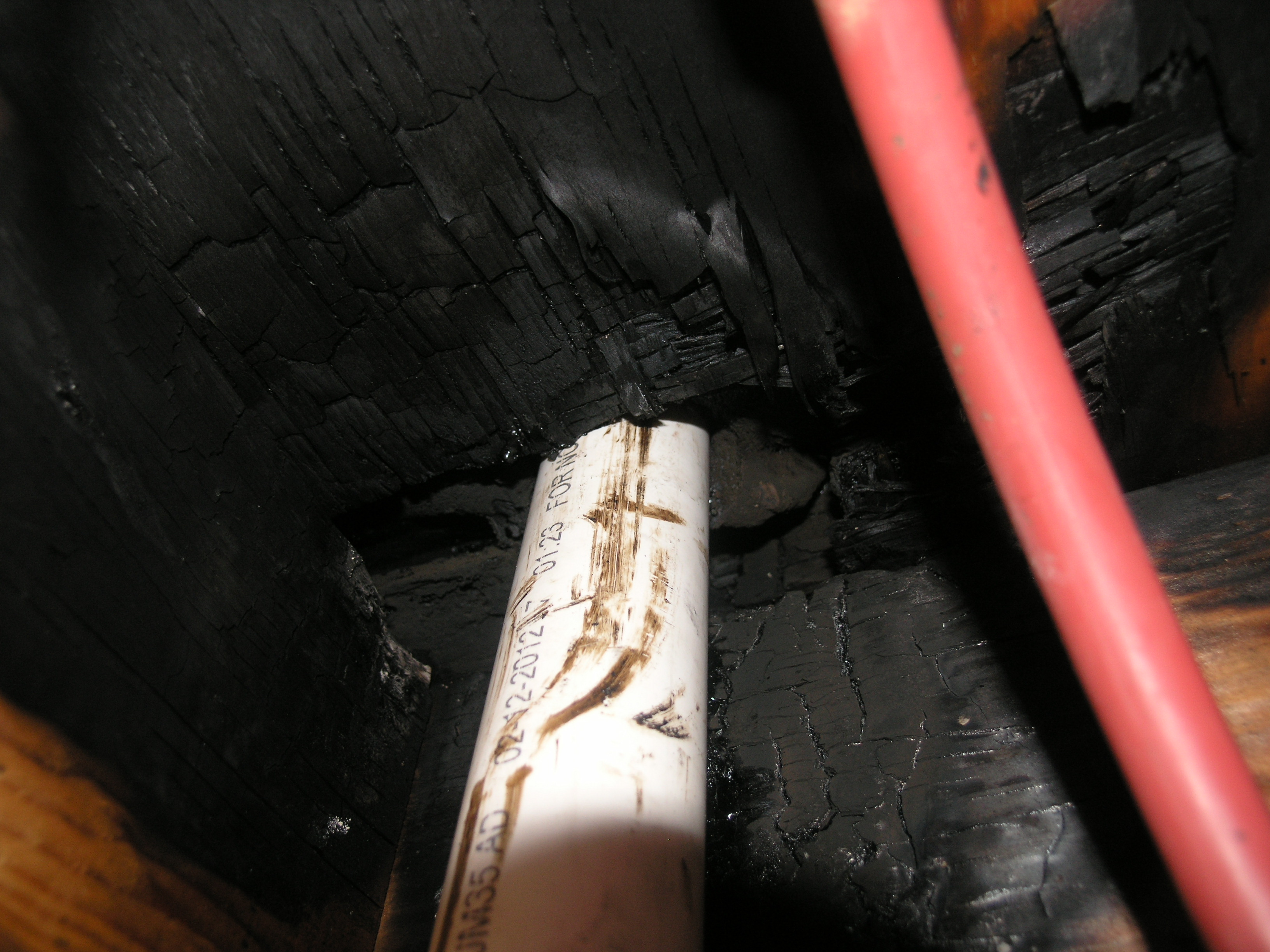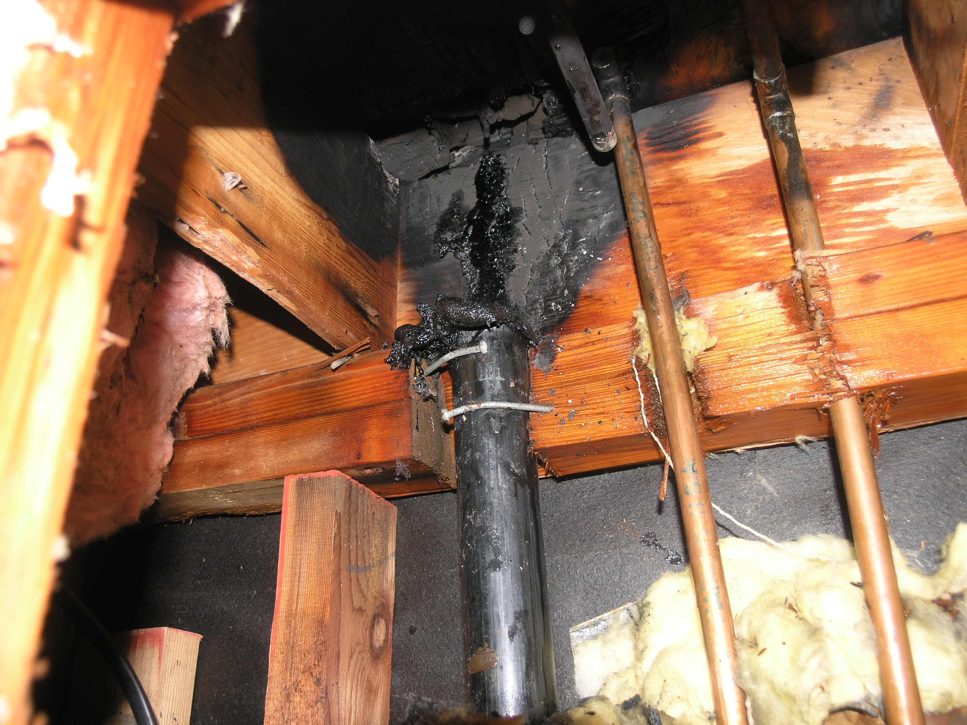 Burnt vent pipe and damaged water pipe. New vent pipe and repaired water pipe.